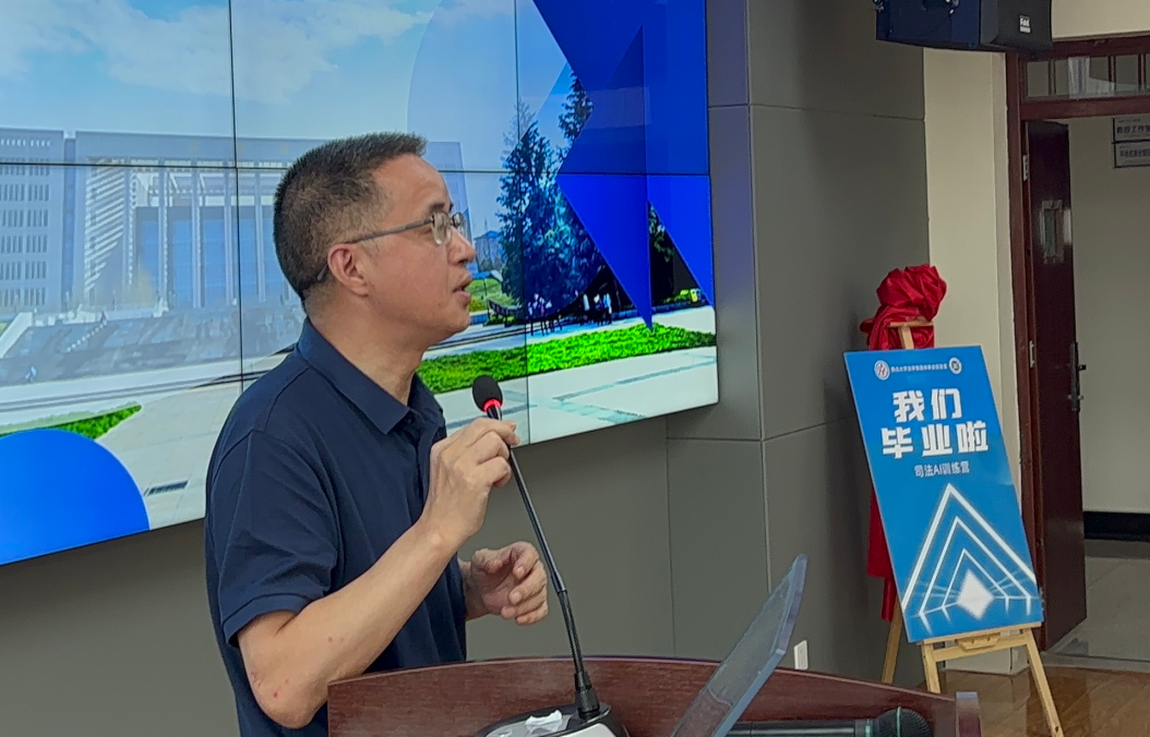 随后,洪新敏主任发表讲话。他表示,本次暑期训练营是探索人工智能与法律深度融合的重要一步,共同见证了学员在AI技术与司法实践结合方面的创新思维和卓越能力。他提到,学员的勤奋致学充分展现了西大校风和精神,积极参与训练营的热情,更是彰显了直面AI挑战、努力提升自我的勇气。洪主任指出,希望学员们能够将所学知识应用于法学学习和研究及法律实践,为推动法治社会的数字化转型贡献力量,期待实验室在未来能够培养出更多具备数字素养的法学人才,从而为跨学科人才培养和国家法治建设社会做出更大的贡献。