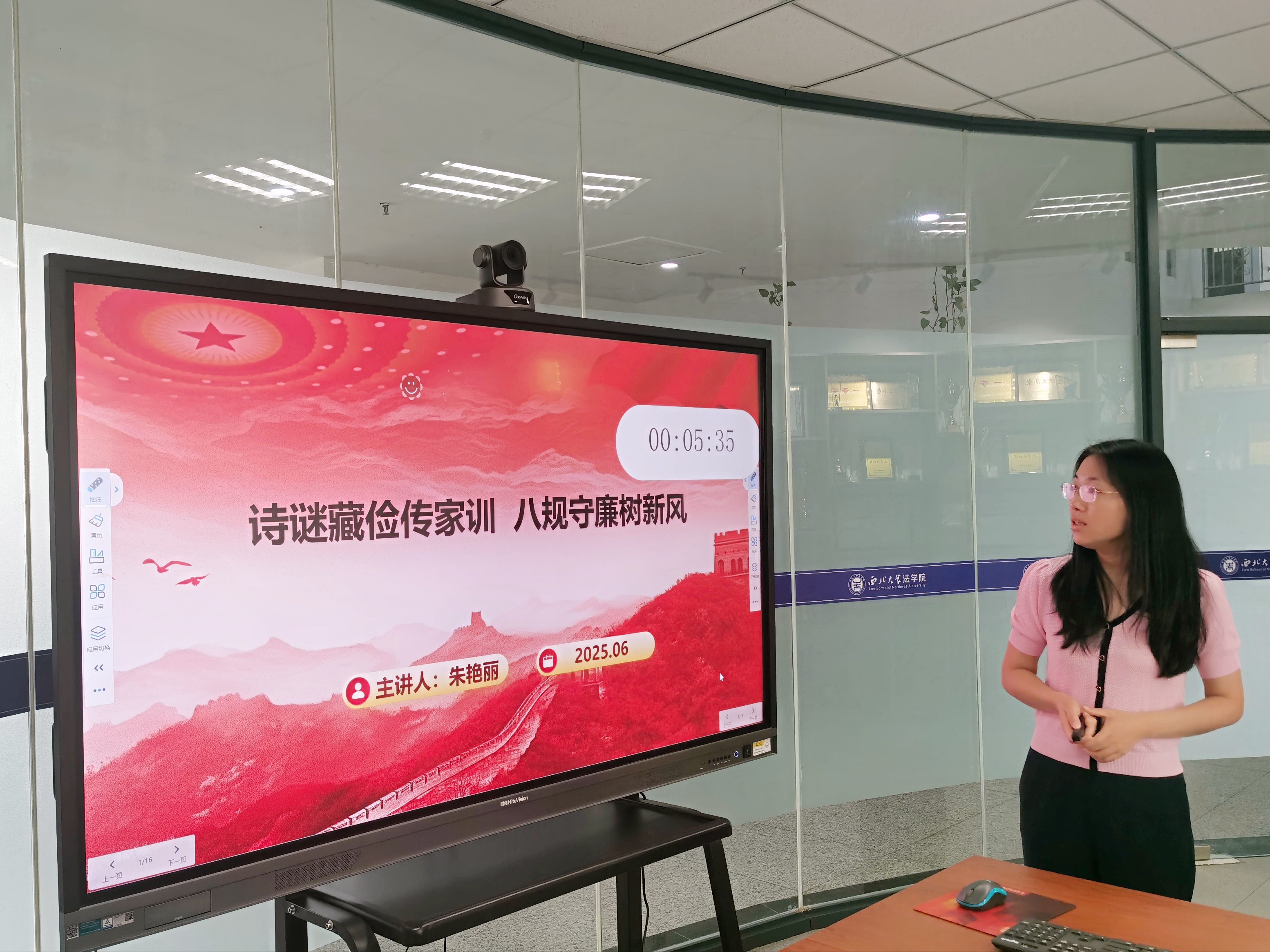 学院教工支部、学生党支部聚焦中央八项规定精神学习教育主题,推荐出7名师生支部书记代表,给大家带来了一场场内容详实、讲述生动的微党课。他们从红色故事、党史精神与高校作风建设,讲到党纪与国法的贯通实践;从坚守纪律底线共建勤俭社会,讲到诗谜藏俭传家训、八规守廉树新风等。从多个角度切入,紧密结合自身经历,图文并茂地生动讲述,通过这种方式将中央八项规定精神学习教育深度融入自身学习与工作。此次微党课比赛与八项规定精神学习教育紧密相连,充分彰显了师生党员对八项规定精神的深刻理解与灵活运用。在比赛过程中,各位参赛选手的表现都十分出色。他们的微党课主题鲜明、内容丰富、形式多样,既有对党的理论知识的深入解读,也有对实际工作的深刻反思;既有对先进典型的学习借鉴,也有对自身问题的剖析整改。他们用生动的语言、鲜活的事例,深入浅出地阐述了中央八项规定精神的内涵和实质。最后经过激烈的角逐,学院选出一名教师和一名学生代表参加学校“铁规淬初心 担当砺作风”第七届党支部书记微党课大赛。
