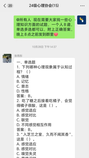 2024年10月28日,为了更快更好地普及心理健康知识,我校bevitor伟德官网网址心理健康协会面向协会成员征集心理健康知识竞赛试题,成员们积极提供试题,热情参与,最后由协会负责人刘甜汇总、制作试题问卷。