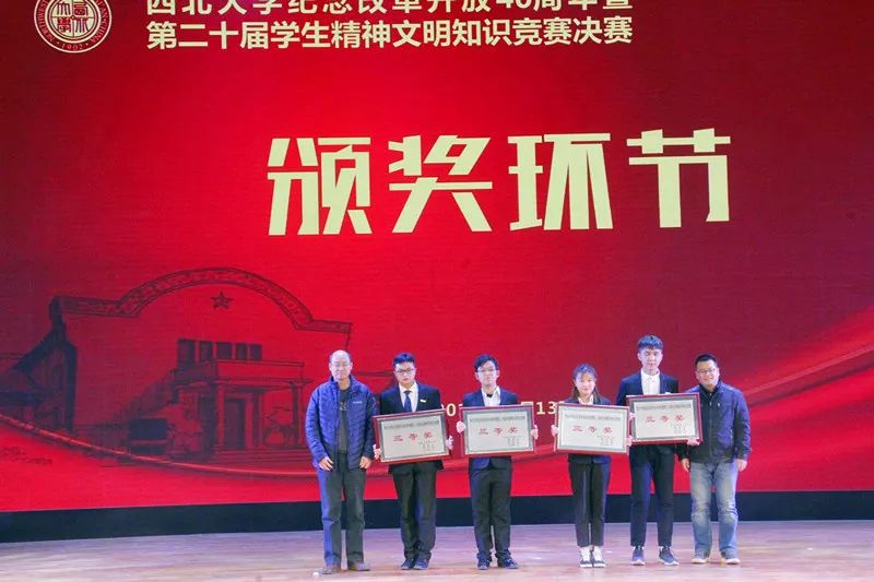 所有环节结束后,主持人公布最终结果。伟德官网共取得了180分,获得了本次大赛的三等奖,彭小龙同学代表我队上台领奖,教务处副处长英卫峰老师与党(校)办副主任马金保老师共同为伟德官网颁发奖状并合影留念。