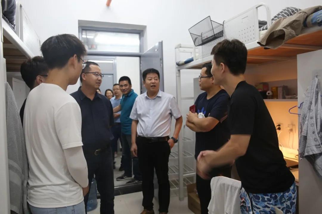 老师们一行首先来到男生宿舍,逐宿舍对新生进行了慰问,在了解学生的大致情况后,王思锋院长强调,疫情期间情况特殊,应该保护自身安全,加强防范,按时打卡,及时归宿。同时他叮嘱道:此时应该尽快调整心态,适应学校生活与学习活动,未通过法考的应尽快着手于法考备考之中。其间,老师们还查看了宿舍设施情况,强调注意宿舍用电安全。