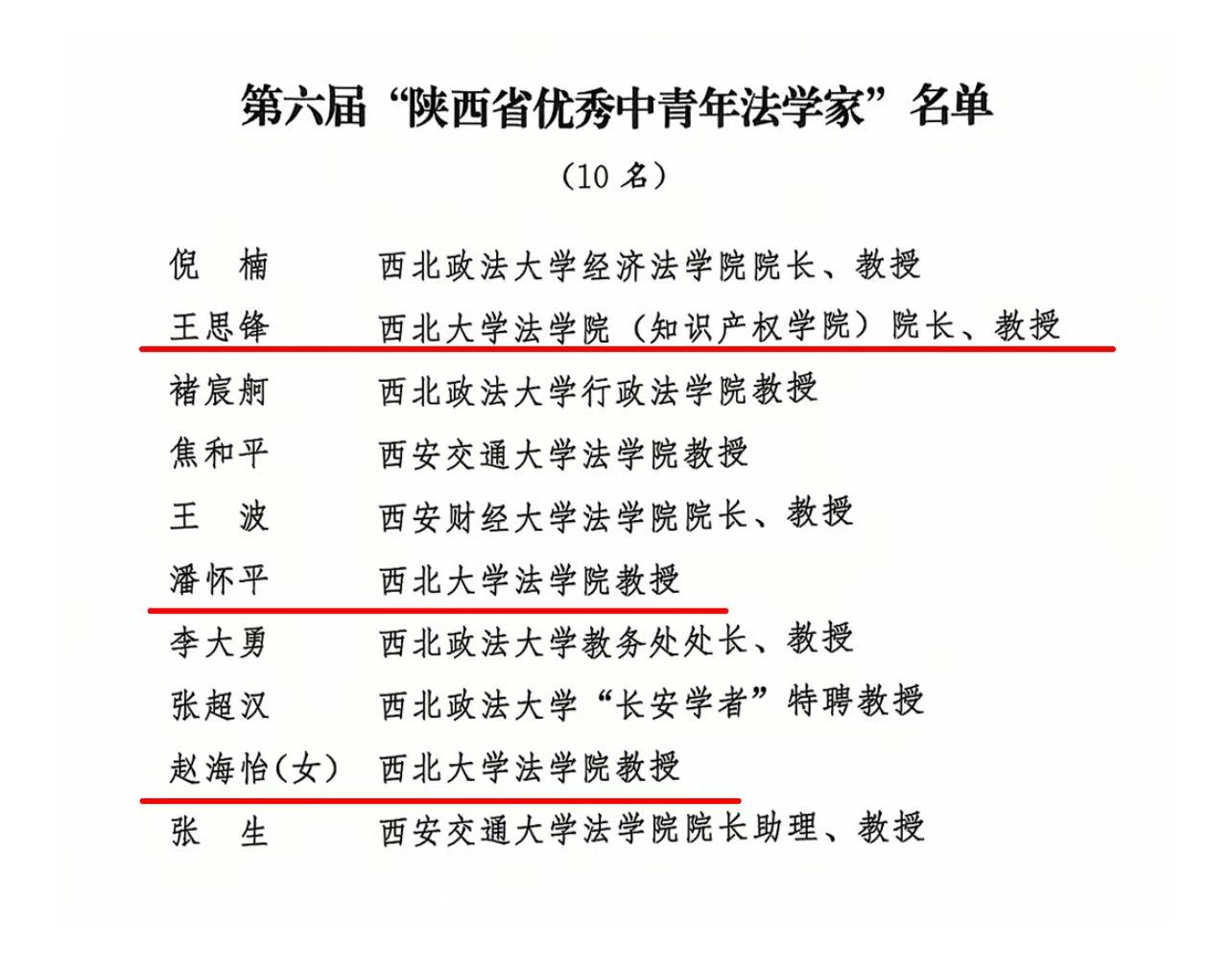 陕西省法学会在全省范围内开展第六届“陕西省优秀中青年法学家”评选活动,经单位推荐、个人申报、资格审查、评审委员会初评、终评等程序,最终评选出第六届“陕西省优秀中青年法学家”10人,第六届“陕西省优秀中青年法学家”提名奖11人。