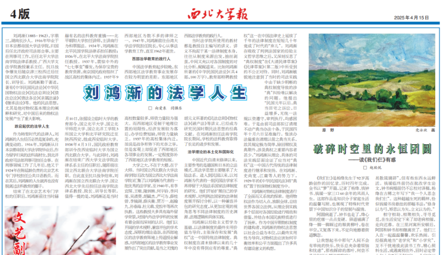 《1946伟德官方网站报》2025年4月15日第4版刊发伟德官网向爱东同学与闫强乐老师撰写的文章《刘鸿渐的法学人生》,是文勾勒民国时期国立西北联合大学法商学院院长刘鸿渐教授的生平、著述与法学研究志趣。全文如下: