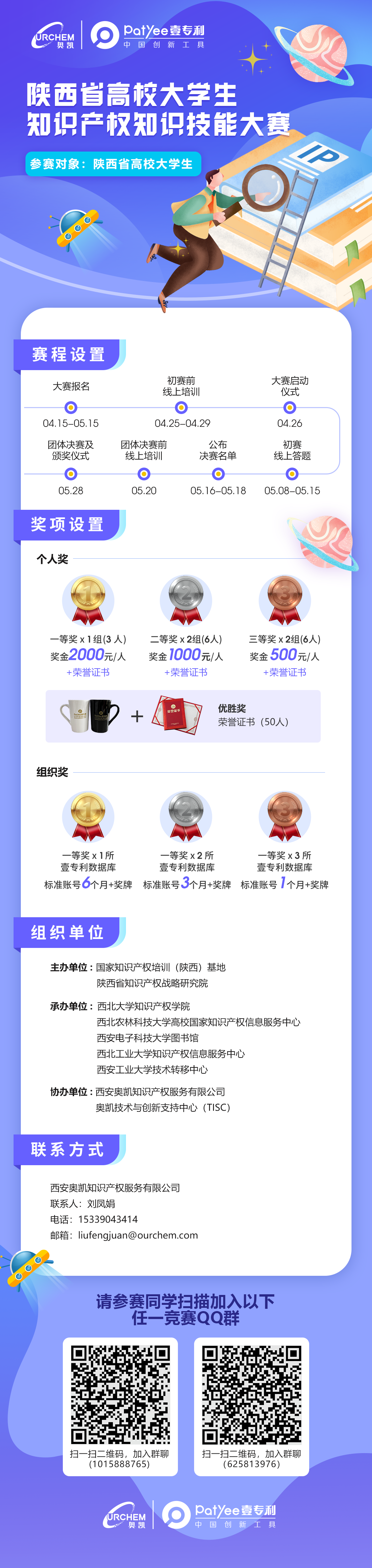 在第22个世界知识产权日来临之际,为贯彻国务院印发的《知识产权强国建设纲要(2021-2035年)》文件精神,增强在陕高校大学生的知识产权保护意识,提升高校青年大学生的科技创新保护能力,国家知识产权培训(陕西)基地和陕西省知识产权战略研究院将联合主办陕西省高校大学生知识产权知识技能大赛。本次比赛将由西安奥凯知识产权服务有限公司提供奖金和证书赞助,并由奥凯技术与创新支持中心(TISC)对获得组织奖的单位提供一定期限的壹专利数据库使用账号的奖励。欢迎广大在陕高校大学生扫码进群,了解赛事进程,并积极准备,按通知要求参加比赛。