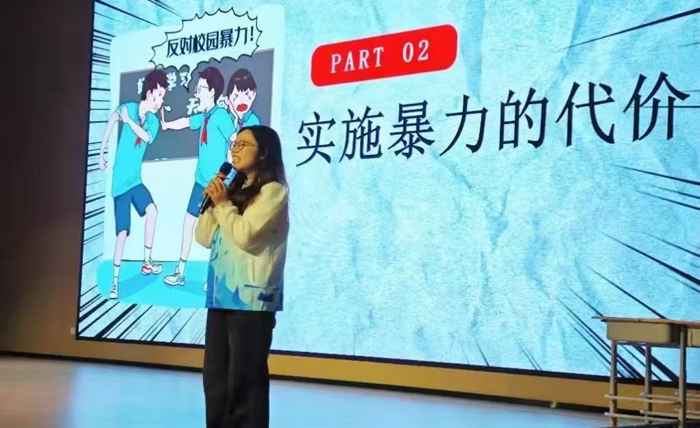 其次,协会志愿者们给大家带来了一堂生动而深刻的普法课堂。此次普法课堂主要围绕“如何预防校园霸凌事件的发生”这一主题,结合近年来发生的典型校园霸凌案例,向同学们讲述了什么是校园霸凌、校园霸凌的具体表现、实施校园霸凌的代价和怎样预防校园霸凌等方面内容。