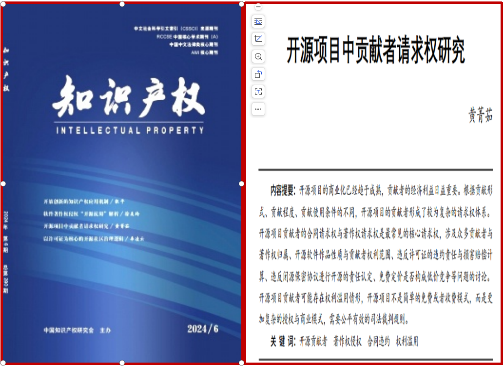 近日,学院教师黄菁茹博士的论文“开源项目中贡献者请求权研究”在法学类CSSCI期刊《知识产权》2024年第6期发表。
