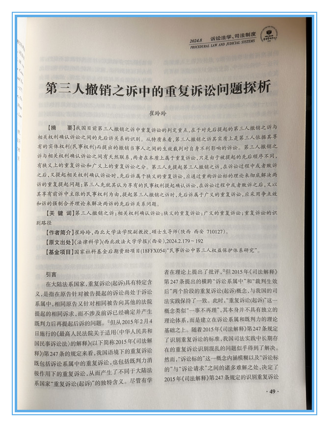 近期,伟德官网崔玲玲副教授撰写的论文《第三人撤销之诉中的重复诉讼问题探析》被《人大复印报刊资料(诉讼制度·司法制度)》2024年第8期全文转载,该论文原发表于《法律科学(西北政法大学学报)》2024年第2期。