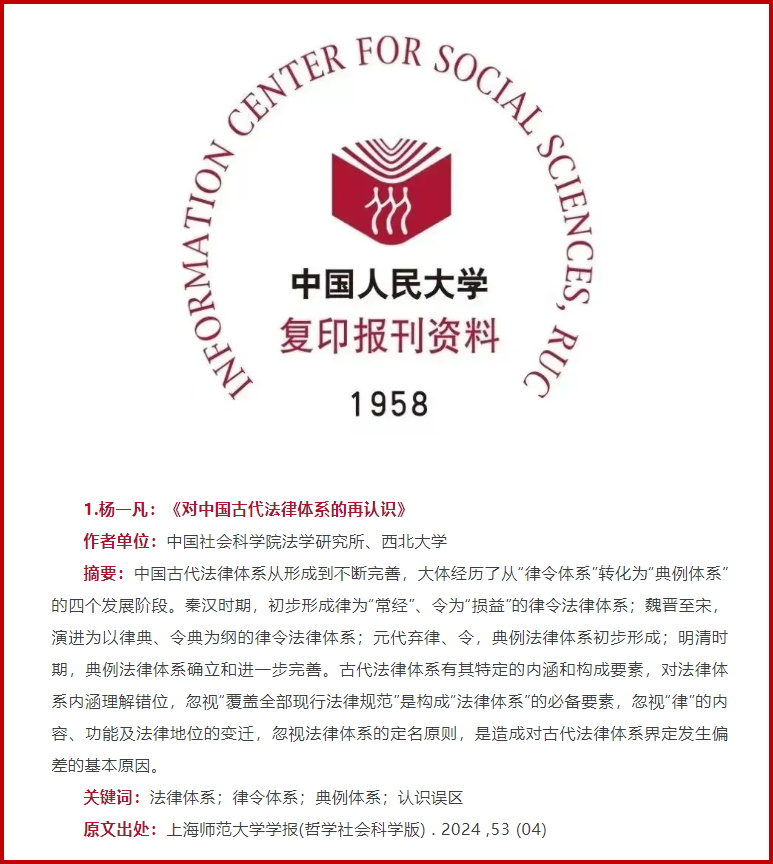 杨一凡学部委员的论文被《人大复印报刊资料》全文转载