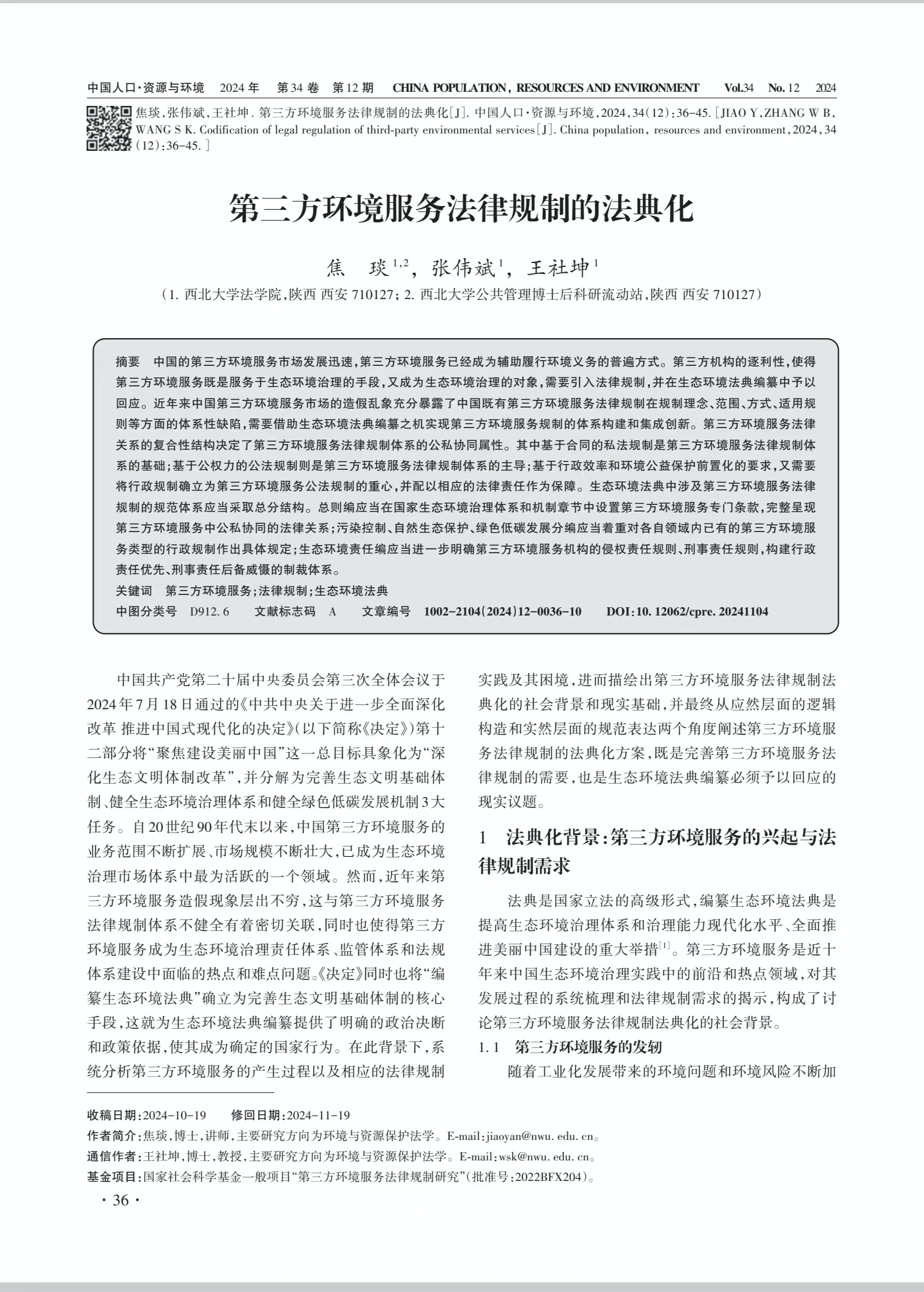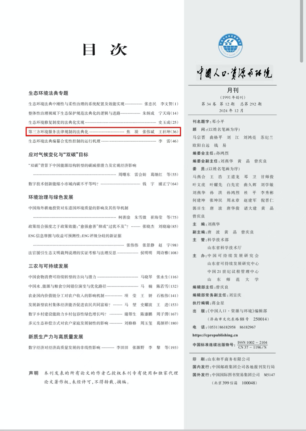 近日,伟德官网环境法研究团队青年教师焦琰博士、硕士研究生张伟斌、王社坤教授(通讯作者)的论文《第三方环境服务法律规制的法典化》在CSSCI来源期刊《中国人口·资源与环境》2024年第12期发表。