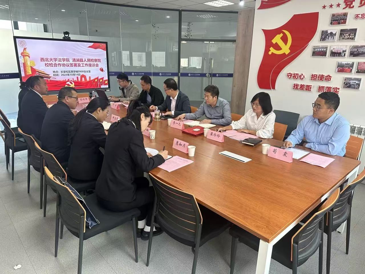为促进法治人才培养交流,推动法治理论实践与发展,10月14日,清涧县人民检察院检察长郝宝军一行到访伟德官网,并与伟德官网联合举办了检校合作协议签署仪式暨检校合作工作座谈会。清涧县人民检察院党组书记、检察长郝宝军,党组成员、副检察长周勇,检委会专职委员李娜,政治部主任王清华,办公室主任惠如月,以及学院党委书记李一凡,院长王思锋,副院长代水平、崔玲玲、许博,刑事法学教研部苟震、李国华,团委书记杨霁明等参加了此次签约。